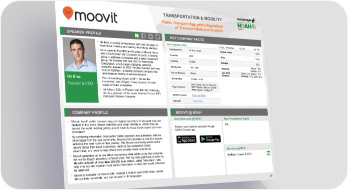 TRANSPORTATION & MOBILITY Public Transport App and a Repository of Transport Data and Analysis SPEAKER PROFILE KEY COMPANY FACTS • Nir Erez is a serial entrepreneur with over 20 years of Key Corporate Facts Traffic Apr-17 Apr-18 experience creating and leading technology startups Headquarters Tel Aviv, Israel Unique Users - 8.7m • Nir is currently the CEO and founder of Moovit. He is Founded 2012 Visits - 13.0m also a Co-founder and Co-owner of Eyron, a holding group of software companies and a seed investment Funding $132m Minutes - 02:51 group. Nir founded and was CEO of ActionBase Corporation, a U.S.based enterprise software Employees 100-1,000 Sessions - Mobile: 76% company acquired in 2003. He also founded and was Desktop: 24% COO of Optimal+, a leading software company that Active Markets Global Apr 2018 Direct: 12%, Search: 12%, revolutionized testing of semiconductors Sources Referrals: 74%, Other: 2% Ownership Private – VCs Nir Erez • Prior to founding Moovit in 2011, Nir led the Founder & CEO investment arm of Eyron Group focused on early - Intel Capital, Sound Ventures, stage software companies Key Investors NGP Capital, Sequoia Capital, • Nir holds a B.Sc. in Physics from Bar Ilan University BRM Capital, Vintage IP and is a graduate of the Israeli Defense Forces (IDF) Computer Science Academy NOAH Content Moovit at NOAH Website moovit.com COMPANY PROFILE MOOVIT @ NOAH • Moovit, the #1 public transport app and biggest repository of transport data and Doing Business @ NOAH Main Presentation Topics analysis in the world. Moovit simplifies your urban mobility in +2200 cities all Present your business proposal through N/A around the world, making getting around town via mass transit easier and more NOAH Connect app convenient • By combining information from public transit operators and authorities with live information from the user community, Moovit offers travelers a real-time picture, including the best route for their journey. The Moovit community sends active reports about their travel experience, such as bus congestion levels, cleanliness, and more to help others have a better travel experience • Moovit generates up to one billion anonymous data points a day that comprise Attendees @ NOAH the world's largest repository of transit data. The Big Data gathering is aided by Nir Erez, Founder & CEO Moovit’s network of more than 300,000 local editors, called “Mooviters”, who help map out and maintain local transit information in cities that would otherwise be unserved • Moovit is available for free on iOS, Android & Web in over 2,000 cities, across 80 countries worldwide, and can be used in 44 languages 79