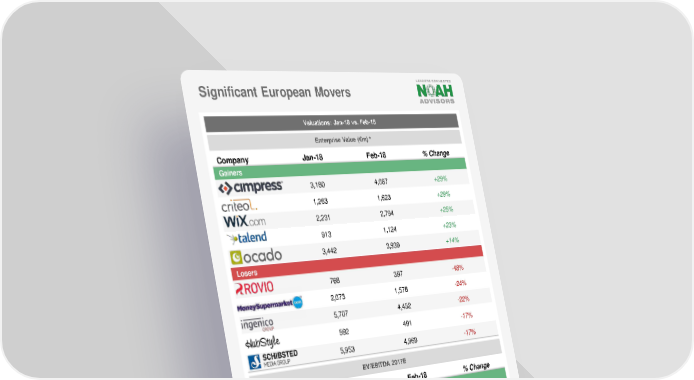 Significant European Movers Valuations: Jan-18 vs. Feb-18 Enterprise Value (€m) * Company Jan-18 Feb-18 % Change Gainers 3,180 4,087 +29% 1,263 1,623 +29% 2,231 2,794 +25% 913 1,124 +23% 3,442 3,939 +14% Losers 768 397 -48% 2,073 1,578 -24% 5,707 4,452 -22% 592 491 -17% 5,953 4,969 -17% EV/EBITDA 2017E Company Jan-18 Feb-18 % Change Gainers 22.4x 30.5x +36% 7.7x 10.2x +32% 4.0x 5.0x +27% 41.8x 51.3x +23% 30.5x 34.2x +12% Losers 13.5x 6.2x -54% 11.5x 8.1x -30% 27.1x 19.5x -28% 16.2x 11.8x -27% 34.5x 30.5x -12% Source: Capital IQ (March 2018). 17 Note: * Companies with enterprise value <€100m excluded.
