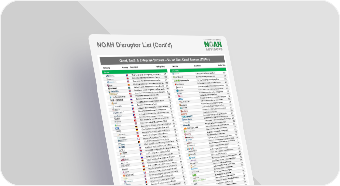 NOAH Disruptor List (Cont'd) Cloud, SaaS, & Enterprise Software – Market Size: Cloud Services ($204bn) Company Country Description Funding ($m) Company Description Funding ($m) Europe USA (Cont.) Web hosting, cloud computing, and servers 279 * B2B application delivery platform 259 Enterprise cyber threat defense software 180 SaaS for property management 255 Developer of cloud-based contract center 141 Storing, managing and analyzing data 248 Electronic voting and electoral modernization 126 Software and hosted service for big data 247 Software asset management and cloud spend 120 Provider of website usage and traffic analysis 112 Commerce platform for selling cloud services 246 * Security and digital identification technologies 110 Cloud-based open platform for applications 243 Six Degree Group Provider of managed data services 106 SaaS for subscription billing and payments 243 Online procurement marketplace 101 SaaS product design platform 235 Security software development company 100 * Provider of identity protection for enterprises 229 Provider of database software 98 B2B cloud computing services company 220 Software-driven storage for unstructured data 92 * Financial and accounting management 220 * Cloud-based email management software 90 SaaS-based software analytics platform 215 SaaS solution for sensitive-data management 81 Providerof analytics and decision science 211 User experience management tools 75 Copy data visualization 208 Data analytics for securityand optimization 74 Customs brokerage and freight forwarder 204 Enterprise Content Management (ECM) 69 Cloud-based enterprise resource planning 194 Provider of SaaS-based office application suite 68 Developer of distributed database technology 190 Cloud platform for application developers 67 Analysis using data from social media 183 Provider of SaaS-based social media tools 65 Web performance and security company 182 Provider of web governance software 55 Cybersecurity products and services 177 Provider of cloud-based HR software 53 HR, payroll and benefits management 176 Java development platform on a PaaS 51 Database platform for business 173 Cloud-based document management software 45 * Platform for business spend management 169 Provider of music hardware and software 44 Mobile Device Management solutions (MDM) 164 Online B2B intelligence tools through platform 42 Object storage platform to build cloud storage 159 SaaS for retailers to replace the PoS 42 Domain name registration service 155 Software licensor and IT service provider 40 Search engine for big data apps 151 Cloud-based applications for small business 38 Cloud-based customer support software 149 Online business management platform 36 Cyber security for business 148 Web analytics and data intelligence platform 35 Monitoring for dynamic cloud infrastructures 148 Web-based business process management 34 Cloud-based waste and recycling solutions 145 Developer of big data software for telecom 34 SaaS-based Technology Business 136 Delivery and logistic management software 31 IaaS company for software developers 123 Workplace and office management 30 Operating system for datacenters 122 Robotic process automation software 30 Cloud-based security company 122 Provider of mobile analytics software 29 Data virtualization software 120 Audio technology for entertainment industry 28 Security and information platform 118 Process mining and big data analysis SaaS 28 Provider of location-related information 116 Provider of DIY website building software 28 * Cloud access security broker 107 Online HR management 25 Cloud-based automation platform 105 Solution for global supply chain risks 24 Big data search and analytics software 104 Open source data analytics software 21 * Data integration, quality and management 102 Ocean freight price comparison platform 21 Business intelligence for monetarization 101 Client feedback platform via PoS terminal 19 Backup, recovery and business continuity 100 SaaS HR and project analytics 19 Business analytics software 94 Platform for connecting different cloud apps 16 Content management and collaboration 89 Anti-malware software products 15 Anti fraud technology for e-commerce 89 Online job matching platform 14 * Online customer support service company 86 IP phone systems and communication solutions 11 Mobile App development platform 85 Provider of an open source graph database 80 USA Cloud-based integrated suite of small business 80 Developer of enterprise business software 2,500 Real-time employee engagement platform 80 Software for visualizing and analyzing data 2,030 Database platform for real-time analytics 78 Cloud platform to drive software innovation 1,700 Analytics platform for the mobile and web 77 Security and systems management solution 1,202 Provider of SaaS presentation software 73 * Platform for data management and analytics 1,040 Cloud monitoring with real-time analytics 66 Cloud file storage 690 Securityfor digital personas and transactions 62 SaaS-based business intelligence platform 672 PaaS for enterprise application development 62 SaaS for HR management and automation 584 Music artist-ticketing and content discovery 61 * Online file sharing and content management 559 Cloud-based recruiting optimization platform 60 Cloud-based electronic signature platform 512 Cloud-based data analytics and integration 60 Online research and insights platform 400 Provider of payroll software and services 57 SaaS log management and analytics service 355 Payroll, benefits and compliance software 53 Cloud-based software provider for sales taxes 320 Password and digital wallet management app 53 * Cloud-based database solutions 311 Cloud identity and access management 53 Planning and performance management 300 Cloud-based HR management software 47 Data access for recovery and development 292 Monitoring and analyzing cloud expenses 40 Managed hosting platform for WordPress 291 Development of enterprise software 38 Cyber security provider 282 Resea
