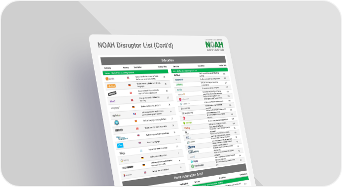 NOAH Disruptor List (Cont'd) Education Company Country Description Funding ($m) Company Description Funding ($m) Europe – Market Size: eLearning ($8.1bn) USA –Market Size: eLearning ($27.1bn) Cloud-based educational software Web-based Git repository hosting 350 for the pre-university market 68 service Online university courses platform 210 Online learning platform for foreign 33 Online learning and teaching languages marketplace 173 Social network that enables its 39 E-learning solutions company 175 users to form study groups Education technology company Free game-based platform for providing lecture capture service 165 learning 27 Online training platform for developers and IT professionals 163 Online mathematics platform 23 Online courses for professionals 160 e-learning tool for academic and Adaptive learning technology 157 career development courses 20 provider online curriculum for kindergarten 150 and elementary school Online language learning platform 15 Online computer programming 120 courses Online tools for teaching science 14 Online language learning platform 108 Online community for crafters 106 featuring online classes Online language learning platform 12 Provider of liberal arts and sciences 95 education Brain training app 10 Social learning network enabling 88 teachers and students to connect Platform that enables educators 59 Interactive sheet music app 10 and employers to share credentials Allows schools to manage all their 43 apps through its platform Online university courses 7 Platform that teaches employable 43 digital skills Online programs for developing Assessment and learning analytics 40 vocational tech skills 6 company Personalized and adaptive language 31 learning platform Online learning platform 6 Online technology school for tech 12 job Home Automation & IoT Company Country Description Funding ($m) Company Description Funding ($m) Europe - Market Size: Home Automation ($1.1bn) USA –Market Size: Home Automation ($3.8bn) Network for communication of 277 Home remodeling, architecture and 614 connected objects interior design platform Provider of M2M (Machine to 100 Wireless multiroom music player 455 Machine) network software Provider of cloud-based M2M 84 connectivity platform Home monitoring via mobile app 209 Provider of tech-enable heating 66 system Platform for housing IoT 124 Location-aware smart thermostat 56 Wireless systems that facilitate 119 communication between devices WiFi and cloud-based internet 44 connectivity services to devices Smart Wi-Fi system for use in 90 Personal weather station with air households quality sensors 39 Free app that allows users to control TVs and DVRs as well as 87 POS systems for the hospitality 37 discover content industry Smart energy efficiency solutions Smart solutions for home for buildings 80 surveillance 26 Cloud management system for 75 Energy marketplace and 25 interoperability and IoT networks management of energy assets Smart home appliances and access Smart controls for all house 16 systems 73 appliances and heating Voice recognition for automobile, 60 Smart lock systems 9 home and mobile Intelligent heat controller 6 Home security solutions 57 Enables the connection of non- 3 Open source platform for managing 25 smart appliances to the network IoT"time-series" data Home automation via smartphone 3 Remote heat controller 10 Source: Crunchbase, Statista, Docebo. 37 * The company went public after July 2014