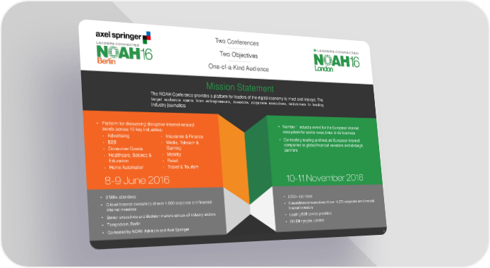 Two Conferences Two Objectives One-of-a-Kind Audience Mission Statement TheNOAHConferenceprovidesaplatform for leaders of the digital economy to meet and interact. The target audience spans from entrepreneurs, investors, corporate executives, networkers to leading industry journalists • Platform for discussing disruptive Internet-related • Number 1 industry event for the European Internet trends across 10 key industries: ecosystem for senior executives to do business • Advertising • Insurance & Finance • Connecting leading and mature European Internet • B2B • Media, Telecom & companies to global financial investors and strategic • Consumer Goods Gaming partners • Healthcare, Science & • Mobility Education • Retail • Home Automation • Travel & Tourism • 3,500+ attendees • 2,500+ attendees • C-level Internet executives of over 1,000 corporate and financial • C-level Internet executives of over 1,000 corporate and financial Internet investors Internet investors • Senior executives and decision makers across all industry sectors • Leading B2B service providers • Tempodrom, Berlin • Old Billingsgate, London • Co-hosted by NOAH Advisors and Axel Springer 2