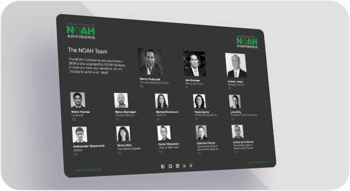 The NOAH Team The NOAH Conference was launched in 2009 and is organised by NOAH Advisors. In case you have any questions, do not hesitate to send us an email Marco Rodzynek Jan Brandes Justus Lumpe Founding Managing Director Managing Director Managing Director Nikhil Parmar Marco Bombach Marina Khrolovich Paula García Livia Götz Associate Creative Director Assistant VP NOAH Partnerships Director of NOAH Conference Aleksander Skwarczek Gema Alba Daniel Wasowicz Gabriela Clauss Carlos de la Huerta Analyst New Media Designer Head of Data Team Sponsorship Sales & Sponsorship Sales & Relationship Manager Relationship Manager www.noah-advisors.com www.noah-conference.com
