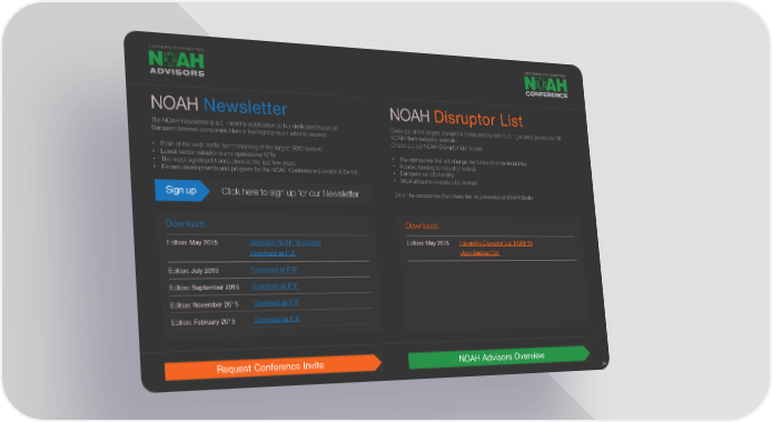 NOAHNewsletter NOAHDisruptor List The NOAH Newsletter is a bi-monthly publication with a dedicated focus on Overview of the largest disruptors (measured by total funding raised) across our 10 European Internet companies Here a few highlights on what to expect: NOAH Berlin industry verticals. Check out our NOAH Disruptor List to see: • State of the web: traffic benchmarking of the largest B2C sectors • Latest sector valuations and operational KPIs • The companies that will change the future of entire industries • The most significant transactions in the last few years • Relative funding by industry vertical • Recent developments and program for the NOAH Conference (London & Berlin) • European vs. US funding • Most attractive investors by vertical Sign up Click here to sign up for our Newsletter 24 of the companies that made the list presented at NOAH Berlin Downloads Downloads Edition: May 2015 Interactive NOAH Newsletter Edition: May 2015 Interactive Disruptor List NOAH15 Download as PDF Download as PDF Edition: July 2015 Download as PDF Edition: September 2015 Download as PDF Edition: November 2015 Download as PDF Edition: February 2016 Download as PDF Request Conference Invite NOAH Advisors Overview 24