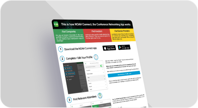 This is how NOAH Connect, the Conference Networking App works Find Companies Find Investors Find Service Providers Are you an investor interested in the next Looking to raise capital or build relationships Looking for state of the art tools and services portfolio company, a service provider looking with investors? There are several options to to improve your business (e.g. marketing, for new clients or just interested in relevant find the right ones for you. payment, work flow tools)? Here is how to meetings? find the right ones. 1 Download the NOAH Connect app 2 Complete / Edit Your Profile Click “My Profile” under the “More” menu to make sure all your information is complete and correct. Make sure your interests for the event are complete as this will allow relevant counterparties to discover and reach out to you. Alternatively, you can also manage your profile through the web interface. Attendee Area / Profile - web Check out the floorplans inside the app to get familiar with the designated areas to schedule your meetings at convenient pre-defined points. 3 Find Relevant Attendees Use the NOAH Connect app to search attendees by sector, country, title or their personal interests. People are listed on company profiles, so can also be discovered via the company / investor search. People Search Click “Search” in the main menu and adjust the search result via “Refine results” 1. Sector – select the industry classification 2. Country – where company is headquartered Alternatively, you can also use the “free text” search. Company / Investor Search Select Companies and adjust the search result via “Refine results” Select Investors and adjust the search result via “Filter / refine your search” 1. Industries – define target investment sectors 2. Active Markets - choose countries which investor is active in 3. Growth Stages – select desired company stage (Seed, VC, Growth, Buyout and Public) Click the company to open the profile page. Identify your point of contact and add to your favorites list, start a conversation or request a meeting. Add to “Favorites”