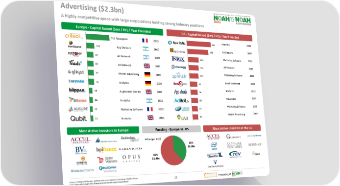 Advertising ($2.3bn) 2005 38% $0.9bn 62% $1.4bn EuropeUS 313 105 87 81 77 75 45 44 35 35 2010 2010 2000 2011 2008 2008 2011 2010 2002 2008 330 288 143 134 124 97 94 89 77 74 New Relic AppNexus INRIX Videology Sprinklr Return Path App Annie AdRoll Urban Airship xAd 2007 2002 2007 2009 2009 1999 2007 2010 2009 A highly competitive space with large corporations holding strong industry positions Retargeter App Delivery Ad Network Ad Network Mobile Advertising Analytics Augmented Reality Analytics Marketing Software Analytics Analytics Ad Platform Marketing Software Ad Network Marketing Software Email Marketing Analytics Retargeter Marketing Software Mobile Advertising 11 Source: Company disclosures, websites and press releases, Crunchbase, NOAH Advisors. Note: Data only includes the 10 largest funding in the segment considered. Europe - Capital Raised ($m) / HQ / Year Founded US - Capital Raised ($m) / HQ / Year Founded Funding - Europe vs. US Most Active Investors in Europe Most Active Investors in the US Presenting at