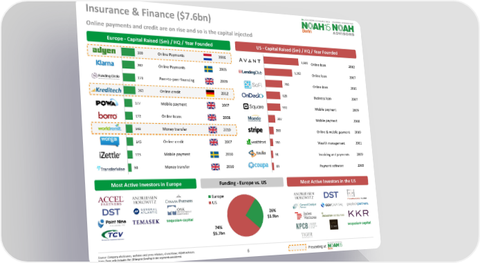 Online payments and credit are on rise and so is the capital injected Insurance & Finance ($7.6bn) 2006 300 282 273 263 177 172 148 145 115 90 Adyen Klarna Funding Circle Kreditech Powa Technologies Borro WorldRemit Wonga iZettle eToro 2005 2009 2012 2007 2008 2010 2007 2010 2010 2012 1,600 1,262 766 628 591 307 200 130 91 89 Avant Lending Club Sofi Ondeck Square Mozido Stripe Wealthfront Taulia Coupa Software 2007 2007 2009 2008 2010 2011 2009 2009 Europe - Capital Raised ($m) / HQ / Year Founded US - Capital Raised ($m) / HQ / Year Founded Online Payments Online Payments Peer-to-peer financing Online credit Mobile payment Online loans Money transfer Online credit Mobile payment Money transfer Online loan Online loan Online loan Business loan Mobile payment Mobile payment Online & mobile payment Wealth management Invoicing and payments Payment software 26% $1.9bn 74% $5.7bn Europe US 6 Source: Company disclosures, websites and press releases, Crunchbase, NOAH Advisors. Note: Data only includes the 10 largest funding in the segment considered. Funding - Europe vs. US Most Active Investors in Europe Most Active Investors in the US Presenting at 2011