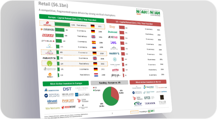 Retail ($6.1bn) 2010 68% $4.2bn 32% $1.9bn US Europe 1,300 781 689 502 271 205 195 194 179 118 Zalando Just Eat Privalia ozon.ru Farfetch HelloFresh WestWing Takeaway.com 2011 2011 2001 2006 1998 2009 2000 2012 2005 334 275 254 225 225 211 122 116 112 65 Etsy Instacart JustFab Jet One Kings Lane HARRY'S Honest Co. Warby Parker GrubHub Nasty Gal 2012 2010 2014 2006 2009 2011 2010 2004 Source: Company disclosures, websites and press releases, Crunchbase, NOAH Advisors. Note: Data only includes the 10 largest funding in the segment considered. A competitive, fragmented space driven by strong vertical champions Food delivery E-commerce Food delivery E-commerce E-commerce E-commerce E-commerce Food delivery E-commerce Food delivery E-commerce Food delivery E-commerce E-commerce E-commerce E-commerce E-commerce E-commerce Food delivery E-commerce 7 Europe - Capital Raised ($m) / HQ / Year Founded US - Capital Raised ($m) / HQ / Year Founded Funding - Europe vs. US Most Active Investors in Europe Most Active Investors in the US Presenting at 2008 2011