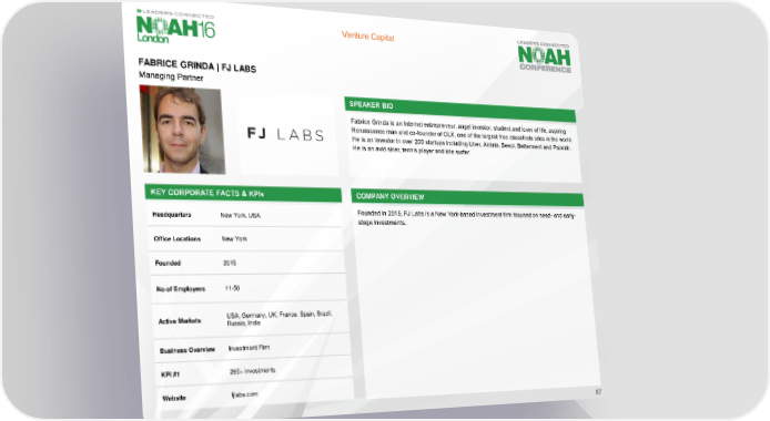 Venture Capital FABRICE GRINDA | FJ LABS Managing Partner SPEAKER BIO Fabrice Grinda is an Internet entrepreneur, angel investor, student and lover of life, aspiring Renaissance man and co-founder of OLX, one of the largest free classifieds sites in the world. He is an investor in over 200 startups including Uber, Airbnb, Beepi, Betterment and Palantir. He is an avid skier, tennis player and kite surfer. KEY CORPORATE FACTS & KPIs COMPANY OVERVIEW Headquarters New York, USA Founded in 2015, FJ Labs is a New York-based investment firm focused on seed- and early- stage investments. Office Locations New York Founded 2015 No of Employees 11-50 Active Markets USA, Germany, UK, France, Spain, Brazil, Russia, India Business Overview Investment Firm KPI #1 260+ investments Website fjlabs.com 57