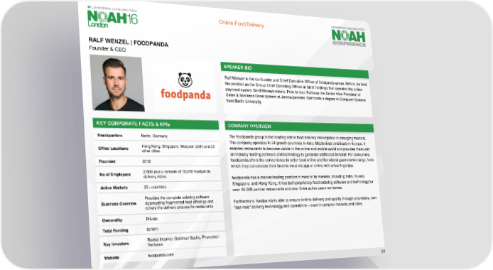 Online Food Delivery RALF WENZEL | FOODPANDA Founder & CEO SPEAKER BIO Ralf Wenzel is the co-founder and Chief Executive Officer of foodpanda group. Before, he held the position as the Group Chief Operating Officer at Skrill Holdings that operates the online payment system Skrill/Moneybookers. Prior to that, Ralf was the Senior Vice-President of Sales & Business Development at Jamba/Jamster. Ralf holds a degree in Computer Science from Berlin University. KEY CORPORATE FACTS & KPIs COMPANY OVERVIEW Headquarters Berlin, Germany The foodpandagroup is the leading online food delivery marketplace in emerging markets. The company operates in 24 growth countries in Asia, Middle East and Eastern Europe. It Office Locations Hong Kong, Singapore, Moscow, Delhi and 20 enables restaurants to become visible in the online and mobile world and provides them with other cities an industry leading software and technology to generate additional demand. For consumers, Founded 2012 foodpandaoffers the convenience to order food online and the widest gastronomic range, from which they can choose their favorite meal via app or online with a few fingertips. No of Employees 2,500 plus a network of 10,000 foodpanda delivery riders foodpandahas a market leading position in most of its markets, including India, Russia, Active Markets 25+ countries Singapore, and Hong Kong. It has built proprietary food ordering software and technology for over 40.000 partner restaurants and over 6mm active users worldwide. Provides the complete ordering software Business Overview aggregating fragmented food offerings and Furthermore, foodpanda is able to ensure in-time delivery and quality through proprietary, own covers the delivery process for restaurants “last-mile” delivery technology and operations – even in complex markets and cities. Ownership Private Total Funding $318m Key Investors Rocket Internet, Goldman Sachs, Phenomen Ventures Website foodpanda.com 59