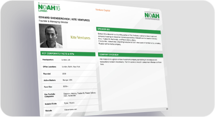 Venture Capital EDWARD SHENDEROVICH | KITE VENTURES Founder & Managing Director SPEAKER BIO Edward Shenderovichis a founding partner of Kite Ventures, a global venture investment company focusing on disruptive Internet opportunities. Edward is on the board of Delivery Hero, Tradeshift, Auctionata, and Plated among others. Prior to Kite, Edward was a founding executive at SUP, now a part of Rambler & Co, a leading Russian online media company. KEY CORPORATE FACTS & KPIs COMPANY OVERVIEW Headquarters London, UK Kite Ventures is a global venture investment company specializing in marketplace and transactional network investments. The firm seeks to invest in companies in Europe and New York. Office Locations London, Berlin, New York Founded 2009 Active Markets Europe, USA Fund Size $250m Key Portfolio Dataminr, Helping, Tradeshift, Plated, Delivery Companies Hero, Auctionata Notable Exists Fyber, Pixonix Website kiteventures.com 80