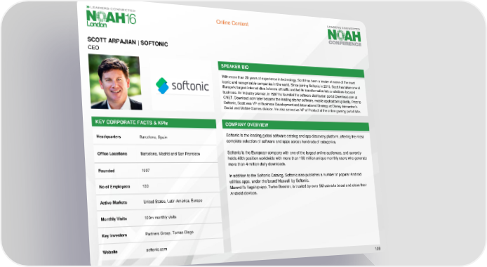 Online Content SCOTT ARPAJIAN | SOFTONIC CEO SPEAKER BIO With more than 20 years of experience in technology, Scott has been a leader at some of the most iconic and recognizable companies in the world. Since joining Softonic in 2015, Scott has taken one of Europe’s largest internet sites in terms of traffic and led its transformation into a solutions-focused business. An industry pioneer, in 1997 he founded the software distribution portal Download.com at CNET. Download.com later became the leading site for software, mobile applications globally. Prior to Softonic, Scott was VP of Business Development and International Strategy at Disney Interactive’s Social and Mobile Games division. He also served as VP of Product at the online gaming portal iWin. KEY CORPORATE FACTS & KPIs COMPANY OVERVIEW Headquarters Barcelona, Spain Softonic is the leading global software catalog and app discovery platform, offering the most complete selection of software and apps across hundreds of categories. Office Locations Barcelona, Madrid and San Francisco Softonic is the European company with one of the largest online audiences, and currently holds 40th position worldwide with more than 100 million unique monthly users who generate more than 4 million daily downloads. Founded 1997 In addition to the Softonic Catalog, Softonic also publishes a number of popular Android No of Employees 130 utilities apps, under the brand Maxwell by Softonic. Maxwell’s flagship app, Turbo Booster, is trusted by over 5M users to boost and clean their Android devices. Active Markets United States, Latin America, Europe Monthly Visits 100mmonthly visits Key Investors Partners Group, Tomas Diago Website softonic.com 109