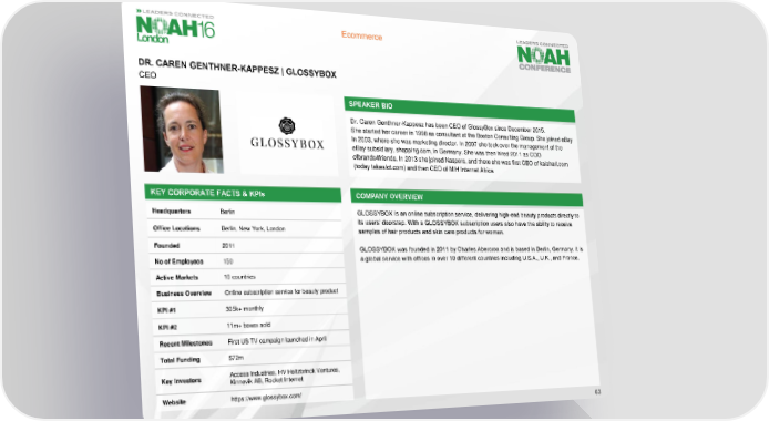 Ecommerce DR. CAREN GENTHNER-KAPPESZ | GLOSSYBOX CEO SPEAKER BIO Dr. Caren Genthner-Kappeszhas been CEO of GlossyBox since December 2015. She started her career in 1998 as consultant at the Boston Consulting Group. She joined eBay in 2003, where she was marketing director. In 2007 she took over the management of the eBay subsidiary, shopping.com, in Germany. She was then hired 2011 as COO ofbrands4friends. In 2013 she joined Naspers, and there she was first CEO of kalahari.com (today takealot.com) and then CEO of MIH Internet Africa. KEY CORPORATE FACTS & KPIs COMPANY OVERVIEW Headquarters Berlin GLOSSYBOX is an online subscription service, delivering high-end beauty products directly to its users’ doorstep. With a GLOSSYBOX subscription users also have the ability to receive Office Locations Berlin, New York, London samples of hair products and skin care products for women. Founded 2011 GLOSSYBOX was founded in 2011 by Charles Abercron and is based in Berlin, Germany. It is No of Employees 150 a global service with offices in over 10 different countries including U.S.A., U.K., and France. Active Markets 10 countries Business Overview Online subscription service for beauty product KPI #1 305k+ monthly KPI #2 11m+boxes sold Recent Milestones First US TV campaign launched in April Total Funding $72m Key Investors Access Industries, HV Holtzbrinck Ventures, Kinnevik AB, Rocket Internet Website https://www.glossybox.com/ 63