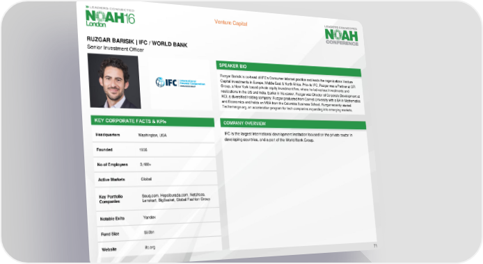 Venture Capital RUZGAR BARISIK | IFC / WORLD BANK Senior Investment Officer SPEAKER BIO RuzgarBarisik is co-head of IFC’s Consumer Internet practice and leads the organizations Venture Capital investments in Europe, Middle East & North Africa. Prior to IFC, Ruzgar was a Partner at GTI Group, a New York based private equity investment firm, where he led various investments and realizations in the US and India. Earlier in his career, Ruzgar was Director of Corporate Development at KCI, a diversified holding company. Ruzgar graduated from Cornell University with a BA in Mathematics and Economics and holds an MBA from the Columbia Business School. Ruzgar recently started Techemerge.org, an acceleration program for tech companies expanding into emerging markets. KEY CORPORATE FACTS & KPIs COMPANY OVERVIEW Headquarters Washington, USA IFC is the largest international development institution focused on the private sector in developing countries, and a part of the World Bank Group. Founded 1956 No of Employees 3,400+ Active Markets Global Key Portfolio Souq.com, Hepsiburada.com, Netshoes, Companies Lenskart, BigBasket, Global Fashion Group Notable Exits Yandex Fund Size $50bn Website ifc.org 71