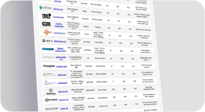 Presenting Companies MainStage 2015 EV / Cap. Company Website Speaker HQCountry Segment Employees Revenues ($m) Raised / Funds Business Description kariyer.net Yusuf Azoz Turkey Classifieds 413 N/A N/A Recruitment portal CEO verivox.com Chris Öhlund Germany Lead 330 N/A N/A Online comparison Group CEO Generation portal kimia.mobi Karel de Beule Spain Advertising 150 N/A N/A Mobile performance Founder marketing network lovoo.net Benjamin Bak Germany Social & Dating 130 N/A N/A Online dating social CEO discovery network softonic.com Scott Arpajian Spain Online Content 130 N/A N/A Software catalog and app CEO discovery platform freeletics.com Daniel Sobhani Germany Online Content 130 N/A N/A Fitness mobile and CEO smart watch app creative- Vladimir Funtikov Co-Founder & CEO Estonia Gaming 100 N/A N/A Mobile games developer mobile.com Paul Flanagan Advisor Celine Lazorthes Fintech, Online Payment software for mangopay.com Founder & CEO France Brokerage & 60 N/A N/A marketplaces Online Betting Tim Schumacher Owner of Adblock Plus adblockplus.org Co-Founder & Germany Advertising 55 N/A N/A ad blocker Chairman deposit- Max von Bismarck Fintech, Online Fixed deposits solutions.com Chief Business Germany Brokerage & 50 N/A N/A online solutions Officer & MD Online Betting blastingnews. Andrea Manfredi UK Online Content 35 N/A N/A Independent news com Founder & CEO platform fraugster.com Max Laemmle Germany Infrastructure 21 N/A N/A Online anti-fraud CEO company Till Janczukowicz Online solution for idagio.com Founder & CEO Germany Online Content 20 N/A N/A Christoph Lange classical music Co-Founder & CPO linguee.com Gereon Frahling Germany Online Content 17 N/A N/A Online translation Founder & CEO services company allthings.me Marc Beermann Switzerland Real Estate N/A N/A N/A Real estate Co-Founder management app contorion.de Tobias Tschötsch Germany Marketplaces N/A N/A N/A B2B marketplace for Founder & CEO MRO products Daniel Raab Online shop for perfume flaconi.de Managing Director, Germany Ecommerce N/A N/A N/A and beauty products SevenVentures excitingcommerce Jochen Krisch Germany Ecommerce N/A N/A N/A Business intelligence .de CEO platform for ecommerce improvedigital. Joelle Frijters Netherlands Advertising N/A N/A N/A Real-time advertising com Co-Founder & CEO platform moneysaving Andy Hancock UK Lead N/A N/A N/A Consumer finance expert.com Managing Director Generation website sybenetix.com Wendy Jephson UK Infrastructure N/A N/A N/A Enterprise behavioral Co-Founder analytics company Martin Bryant Entrepreneurship techcityuk.com Community Editor, UK Media N/A N/A N/A growth program for UK Tech North Note: All private company valuations are based on public news. * Public company. 11