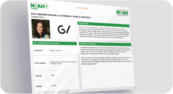 Venture Capital AVID LARIZADEH DUGGAN | GV (FORMERLY GOOGLE VENTURES) General Partner SPEAKER BIO Prior to GV, Avid co-founded Boticca, a global marketplace for independent brands of fashion accessories (acquired by Wolf & Badger in 2015). Avid has been involved in the startup ecosystem as a developer, product manager, founder, investor, and advisor since 1998. Avid started investing at Accel Partners in London in 2006, where she focused on software and Internet investments. She also held product management roles at Tellme Networks, eBay, and Skype, and began programming in college. While at eBay, Avid was granted a patent for her work on a suite of selling tools. KEY CORPORATE FACTS & KPIs COMPANY OVERVIEW Launched as Google Ventures in 2009, GV is the venture capital arm of Alphabet, Inc. We’ve Headquarters Mountain View, USA invested in more than 300 companies that push the edge of what’s possible. In the fields of life science, healthcare, artificial intelligence, robotics, transportation, cyber security, and agriculture, our companies aim to improve lives and change industries. We’ve built a team of world-class engineers, designers, physicians, scientists, marketers, and investors who work together to provide these startups exceptional support on the road to Mountain View, San Francisco, New York City, Office Locations Cambridge, London success. We help our companies interface with Google, providing unique access to the world’s best technology and talent. Founded 2009 Website gv.com 65