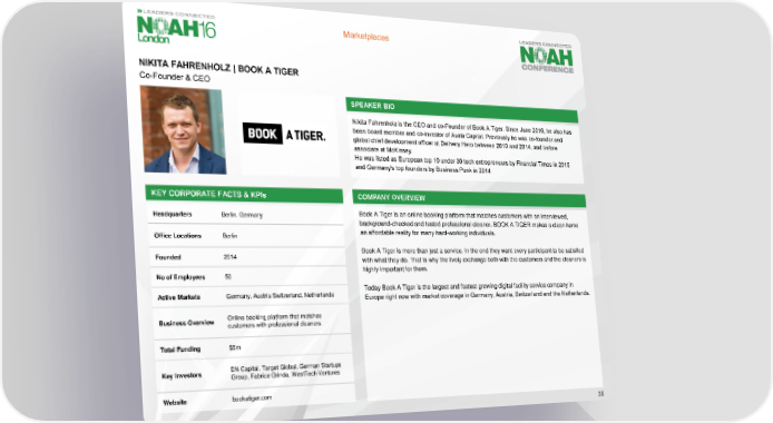 Marketplaces NIKITA FAHRENHOLZ | BOOK A TIGER Co-Founder & CEO SPEAKER BIO Nikita Fahrenholz is the CEO and co-Founder of Book A Tiger. Since June 2016, he also has been board member and co-investor of Avala Capital. Previously he was co-founder and global chief development officer at Delivery Hero between 2010 and 2014, and before associate at McKinsey. He was listed as European top 10 under 30 tech entrepreneurs by Financial Times in 2015 and Germany's top founders by Business Punk in 2014 KEY CORPORATE FACTS & KPIs COMPANY OVERVIEW Headquarters Berlin, Germany Book A Tiger is an online booking platform that matches customers with an interviewed, background-checked and tested professional cleaner. BOOK A TIGER makes a clean home Office Locations Berlin an affordable reality for many hard-working individuals. Founded 2014 Book A Tiger is more than just a service. In the end they want every participant to be satisfied with what they do. That is why the lively exchange both with the customers and the cleaners is No of Employees 50 highly important for them. Active Markets Germany, Austria Switzerland, Netherlands Today Book A Tiger is the largest and fastest growing digital facility service company in Europe right now with market coverage in Germany, Austria, Switzerland and the Netherlands. Business Overview Online booking platform that matches customers with professional cleaners. Total Funding $5m Key Investors DN Capital, Target Global, German Startups Group, Fabrice Grinda, WestTech Ventures Website bookatiger.com 35