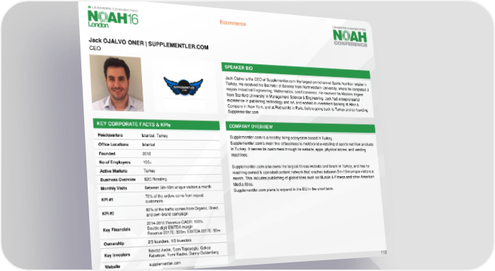 Ecommerce Jack OJALVO ONER | SUPPLEMENTLER.COM CEO SPEAKER BIO Jack Ojalvo is the CEO of Supplementler.com the largest omnichannel Sports Nutrition retailer in Turkey. He received his Bachelor of Science from Northwestern University, where he completed 3 majors Industrial Engineering, Mathematics, and Economics. He received his Masters degree from Stanford University in Management Science & Engineering. Jack had entrepreneurial experience in publishing technology and art, and worked in investment banking at Allen & Company in New York, and at Rothschild in Paris, before going back to Turkey and co-founding Supplementler.com KEY CORPORATE FACTS & KPIs COMPANY OVERVIEW Headquarters Istanbul, Turkey Supplementler.com is a healthy living ecosystem based in Turkey. Office Locations Istanbul Supplementler.com’s main line of business is multibrand e-retailing of sports nutrition products in Turkey. It serves its customers through its website, apps, physical stores, and vending Founded 2012 machines. No of Employees 100+ Active Markets Turkey Supplementler.com also owns the largest fitness website and forum in Turkey, and has far reaching owned & operated content network that reaches between 5m-10m unique visitors a Business Overview B2C Retailing month. This includes publishing of global titles such as Muscle & Fitness and other American Monthly Visits Between 5m-10m unique visitors a month Media titles. Supplementler.complans to expand in the EU in the short term. KPI #1 70% of the orders come from repeat customers KPI #2 80% of the traffic comes from Organic, Direct, and own-brand campaign 2014-2016 Revenue CAGR: 100% Key Financials Double digit EBITDA margin Revenue 2017E: $30m, EBITDA 2017E: $5m Ownership 2/3 founders, 1/3 investors Key Investors Nevzat Aydın, Cem Topcuoglu, Gokce Kabatepe, Yomi Kastro, Danny Goldenberg Website supplementler.com 112