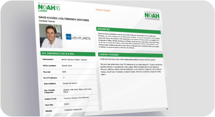Venture Capital DAVID KUCZEK | HOLTZBRINCK VENTURES General Partner SPEAKER BIO David has been at Holtzbrinck Ventures since 2006. David was instrumental in HV’s investment in Westwing, one of the leading home and living shops worldwide. He was an early believer in the disruptive opportunity that the liberalization of the long-distance bus market in Germany offered, and initiated HV’s investment in FlixBus. Besides Westwing and Flixbus, David has been responsible, among other things, for the fund’s investments in Kiveda and Lecturio.Prior to Holtzbrinck Ventures, David worked on an e- learning implementation project at the Sloan School of Management in Cambridge (USA) and a global knowledge management project at Siemens AG in Munich. KEY CORPORATE FACTS & KPIs COMPANY OVERVIEW Headquarters Munich, Germany & Berlin, Germany Holtzbrinck Ventures is one of the leading independent European Internet investors. Office Locations Munich, Berlin The team has backed more than 150 companies in very early stages for 16 years and deploys significant follow-on investments in later stages. With successful exits such as Quandoo, Groupon, AdScale, betreut and brands4friends, current portfolio companies include Zalando, Founded 2000 Flixbus, HelloFresh, Thermondo, Scalable Capital, Ottonova, Auctionata, Depop and many others. No of Employees 17 Active Markets Europe and beyond Key Portfolio Zalando, HelloFresh, flixbus, thermondo, Companies Depop Notable Exists Quandoo, Groupon, brands4friends Fund Size $560m Website holtzbrinck-ventures.com 66