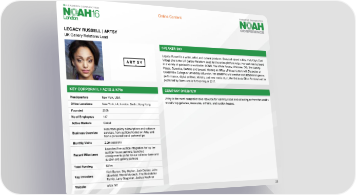 Online Content LEGACY RUSSELL | ARTSY UK Gallery Relations Lead SPEAKER BIO Legacy Russell is a writer, artist, and cultural producer. Born and raised in New York City's East Village she is the UK Gallery Relations Lead for the online platform Artsy. Her work can be found in a variety of publications worldwide: BOMB, The White Review, Rhizome, DIS, The Society Pages, Guernica, Berfrois and beyond. Holding an MRes of Visual Culture with Distinction at Goldsmiths College of University of London, her academic and creative work focuses on gender, performance, digital selfdom, idolatry, and new media ritual. Her first book Glitch Feminism will be published by Verso and is forthcoming in 2017. KEY CORPORATE FACTS & KPIs COMPANY OVERVIEW Headquarters New York, USA Artsy is the most comprehensive resource for learning about and collecting art from the world’s Office Locations NewYork, LA, London, Berlin, Hong Kong world’s top galleries, museums, art fairs, and auction houses. Founded 2009 No of Employees 147 Active Markets Global Fees from gallery subscriptions and software Business Overview services, from auctions hosted on Artsy and from sponsored brand partnerships Monthly Visits 2.2m sessions Launched live auction integration for top tier Recent Milestones auction house partners; launched consignments portal for our collector base and auction and gallery partners Total Funding $51m Rich Barton, Sky Dayton, Jack Dorsey, John Key Investors Elderfield, Wendi Murdoch, The Rockefeller Family, Larry Gagosian, Joshua Kushner Website artsy.net 25