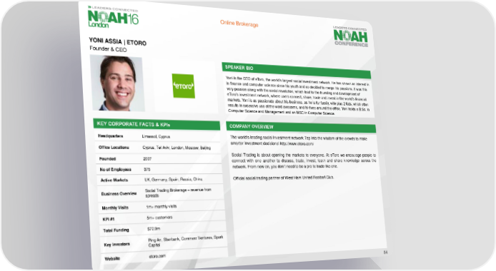 Online Brokerage YONI ASSIA | ETORO Founder & CEO SPEAKER BIO Yoni is the CEO of eToro, the world’s largest social investment network. He has shown an interest in in finance and computer science since his youth and so decided to merge his passions. It was this very passion along with the social revolution, which lead to the founding and development of eToro’s investment network, where users connect, share, trade and invest in the world’s financial markets. Yoni is as passionate about his business, as he is for family, wife plus 2 kids, which often results in excessive use of the word awesome, and hi-fives around the office. Yoni holds a B.Sc. in Computer Science and Management and an MSC in Computer Science. KEY CORPORATE FACTS & KPIs COMPANY OVERVIEW Headquarters Limassol, Cyprus The world's leading social investment network.Tap into the wisdom of the crowds to make smarter investment decisions! http://www.etoro.com/ Office Locations Cyprus, Tel Aviv, London, Moscow, Beijing Founded 2007 Social Trading is about opening the markets to everyone. At eToro we encourage people to connect with one another to discuss, trade, invest, learn and share knowledge across the No of Employees 375 network. From now on, you don’t need to be a pro to trade like one. Active Markets UK, Germany, Spain, Russia, China Official social trading partner of West Ham United Football Club. Business Overview Social Trading Brokerage – revenue from spreads Monthly Visits 1m+monthly visits KPI #1 5m+customers Total Funding $72.9m Key Investors Ping An, Sberbank, CommerzVentures, Spark Capital Website etoro.com 54