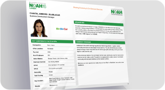 Sharing Economy & On-Demand Services CHANTAL AMBORD | BLABLACAR Business Development Manager SPEAKER BIO Chantal is a business developer in charge of BlaBlaCar’s international and new business expansion. Before joining BlaBlaCar, Chantal spent five years working in Asia, notably driving the marketing efforts of the Hong Kong Stock Exchange in Europe and contributing to the listing of international companies such as Prada in Hong Kong. Chantal speaks five languages and holds an MBA degree from INSEAD. KEY CORPORATE FACTS & KPIs COMPANY OVERVIEW Headquarters Paris, France BlaBlaCar is the world’s leading long-distance ridesharing platform – a global, trusted Office Locations Worldwide community of drivers and passengers in 22 countries. The site and mobile apps connect people looking to travel long distances with drivers going the same way, so they can travel Founded 2006 together and share the cost. No of Employees 500 Each passenger makes a fair contribution for their seat, and drivers cover their fuel and toll Active Markets Europe, Russia, Latin America, India costs but do not make a profit. The platform is engineered to create a secure, trust-based community with declared identities and full member profiles. Business Overview Car sharing website KPI #1 25m members in 22 countries Members can even specify how chatty they are from “Bla” to “BlaBlaBla”, hence the name BlaBlaCar. KPI #2 10m travelers per quarter Ownership Private Total Funding €300m ISAI, Accel Partners, Index Ventures, Lead Key Investors Edge Capital, Insight Venture Partners, Vostok new Ventures Website Blablacar.com 31