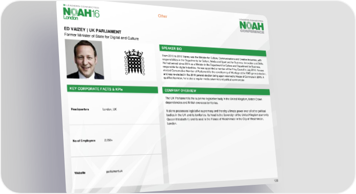 Other ED VAIZEY | UK PARLIAMENT Former Minister of State for Digital and Culture SPEAKER BIO From 2010 to 2016 Vaizey was the Minister for Culture, Communications and Creative Industries, with responsibilities in the Departments for Culture, Media and Sport and for Business, Innovation and Skills. He had served since 2014 as a Minister in the Department for Culture and Department for Business, responsible for digital industries. He was appointed a member of the Privy Council in July 2016. He was elected Conservative Member of Parliament for the constituency of Wantage at the 2005 general election, and was re-elected in the 2010 general election being again returned to House of Commons in 2015. A qualified barrister, he is also a regular media columnist and political commentator. KEY CORPORATE FACTS & KPIs COMPANY OVERVIEW The UK Parliament is the supreme legislative body in the United Kingdom, British Crown dependencies and British overseas territories. Headquarters London, UK It alone possesses legislative supremacy and thereby ultimate power over all other political bodies in the UK and its territories. Its head is the Sovereign of the United Kingdom (currently Queen Elizabeth II) and its seat is the Palace of Westminster in the City of Westminster, London. No of Employees 2,050+ Website parliament.uk 120