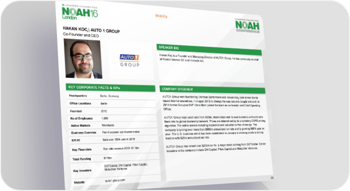 Mobility HAKAN KOÇ| AUTO 1 GROUP Co-Founder and CEO SPEAKER BIO HakanKocis a Founder and Managing Director of AUTO1 Group. He has previously worked ̧ at Rocket Internet SE and Home24 AG. KEY CORPORATE FACTS & KPIs COMPANY OVERVIEW Headquarters Berlin, Germany AUTO1 Group was founded by Christian Bertermannand Hakan Koç, both former Berlin based internet executives, in August 2012 to change the way cars are bought and sold. In Office Locations Berlin 2014 former Groupon SVP Chris Muhr joined the team as co-founder and Chief Operating Founded 2012 Officer. No of Employees 1,800 AUTO1 Group buys used cars from OEMs, dealerships and its own business units and sells them into its global dealership network. Prices are determined by its proprietary CORE pricing Active Markets Worldwide algorithm. The entire service including inspection and valuation is free of charge. The Business Overview Pan-European car market maker company is turning over more than $850m annualized run rate and is growing 800% year on year. The U.S. business which has been established in January is showing similarly strong KPI #1 Sold over 150k cars in 2015 traction with $25m annualized run rate. Key Financials Runrate revenue 2016: €1.5bn AUTO1 Group has raised over $200m so far, a major stake coming from DSTGlobal. Earlier investors in the company include DN Capital, Piton Capital and Mutschler Ventures. Total Funding €178m DSTGlobal, DN Capital, Piton Capital, Key Investors Mutschler Ventures Website auto1-group.com 26