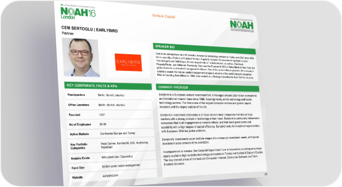 Venture Capital CEM SERTOGLU | EARLYBIRD Partner SPEAKER BIO Cemis an entrepreneur and VC investor, focused on technology ventures in Turkey and CEE since 2006. He is currently a Partner at Earlybird Venture Capital in Istanbul. His investment highlights include YemekSepeti and GittiGidiyor, the two largest exits in Turkish internet, as well as, Hazelcast, PropertyFinder, and Wikimart.Previously, Cem was the Founder & CEO of SelectMinds in New York, the global leader in social talent management software. One of the social software pioneers, the company’s solutions enable the human capital management programs at some of the world’s largest companies. Prior to founding SelectMinds in 1999, Cem worked as a Strategy Consultant in New York for six years. KEY CORPORATE FACTS & KPIs COMPANY OVERVIEW Headquarters Berlin, Munich, Istanbul Earlybird is a European venture investment firm. It manages around US$1 billion in assets for an international investor base since 1998, focusing mainly on the technology and health Office Locations Berlin, Munich, Istanbul technology sectors. The firm is one of the largest European venture and growth capital investors and the largest outside of the UK. Founded 1997 Earlybird’s investment philosophy is to focus on non-linear companies that disrupt large markets with a strong product or technology at their heart. Earlybird is particularly interested in No of Employees 20-50 companies that build engagement or network effects, and that reach proof points and scalability with a high degree of capital efficiency. Earlybird looks for investment opportunities Active Markets Continental Europe and Turkey with European DNA but global ambition. Key Portfolio Peak Games, Number26, B2X, Auctionata, Earlybird's investments cover multiple stages of a company's investment needs, with typical Companies Hazelcast investment sizes between €1m and €20m. Notable Exists 6Wunderkinder, Carpooling Headquartered in Istanbul, the Earlybird Digital East Fund is focused on providing early stage equity capital to high-potential technology companies in Turkey and Central & Eastern Europe. The key interest areas of the fund are Consumer Internet, Enterprise Software and Tech- FundSize €600m under active management Enabled Services. Website earlybird.com 50