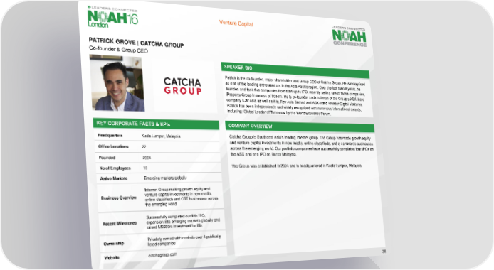 Venture Capital PATRICK GROVE | CATCHA GROUP Co-founder & Group CEO SPEAKER BIO Patrick is the co-founder, major shareholder and Group CEO of Catcha Group. He is recognised as one of the leading entrepreneurs in the Asia Pacific region. Over the last twelve years, he founded and took five companies from start-up to IPO, recently selling one of those companies, iProperty Group in excess of $534m. He is co-founder and chairman of the Group’s ASX-listed company iCar Asia as well as iflix, Rev Asia Berhad and ASX-listed Frontier Digital Ventures. Patrick has been independently and widely recognised with numerous international awards, including: Global Leader of Tomorrow by the World Economic Forum. KEY CORPORATE FACTS & KPIs COMPANY OVERVIEW Headquarters Kuala Lumpur, Malaysia CatchaGroup is Southeast Asia's leading Internet group. The Group has made growth equity and venture capital investments in new media, online classifieds, and e-commerce businesses Office Locations 22 across the emerging world. Our portfolio companies have successfully completed four IPOs on Founded 2004 the ASX and one IPO on Bursa Malaysia. No of Employees 10 The Group was established in 2004 and is headquartered in Kuala Lumpur, Malaysia. Active Markets Emerging markets globally Internet Group making growth equity and Business Overview venture capital investments in new media, online classifieds and OTT businesses across the emerging world Successfully completed our fifth IPO, Recent Milestones expansion into emerging markets globally and raised US$50m investment for iflix Ownership Privately owned with controls over 4 publically listed companies Website catchagroup.com 38