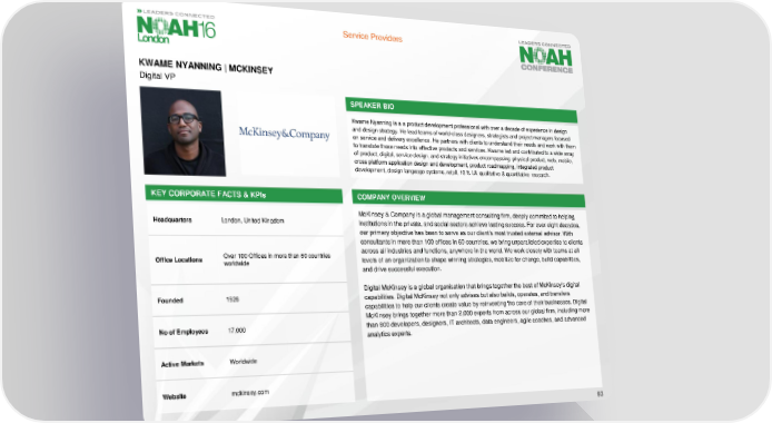 Service Providers KWAME NYANNING | MCKINSEY Digital VP SPEAKER BIO Kwame Nyanning is a a product development professional with over a decade of experience in design and design strategy. He lead teams of world-class designers, strategists and project managers focused on service and delivery excellence. He partners with clients to understand their needs and work with them to translate those needs into effective products and services. Kwame led and contributed to a wide array of product, digital, service design, and strategy initiatives encompassing: physical product, web, mobile, cross platform application design and development, product roadmapping, integrated product development, design language systems, retail, 10 ft. UI, qualitative & quantitative research. KEY CORPORATE FACTS & KPIs COMPANY OVERVIEW McKinsey & Company is a global management consulting firm, deeply commited to helping Headquarters London, United Kingdom institutions in the private, and social sectors achieve lasting success. For over eight decades, our primary objective has been to serve as our client’s most trusted external advisor. With consultants in more than 100 offices in 60 countries, we bring unparalleled expertise to clients Over 100 Offices in more than 60 countries across all industries and functions, anywhere in the world. We work closely with teams at all Office Locations worldwide levels of an organization to shape winning strategies, mobilize for change, build capabilities, and drive successful execution. Digital McKinsey is a global organisation that brings together the best of McKinsey’s digital Founded 1926 capabilities. Digital McKinsey not only advises but also builds, operates, and transfers capabilities to help our clients create value by reinventing the core of their businesses. Digital McKinsey brings together more than 2,000 experts from across our global firm, including more No of Employees 17,000 than 800 developers, designers, IT architects, data engineers, agile coaches, and advanced analytics experts. Active Markets Worldwide Website mckinsey.com 93