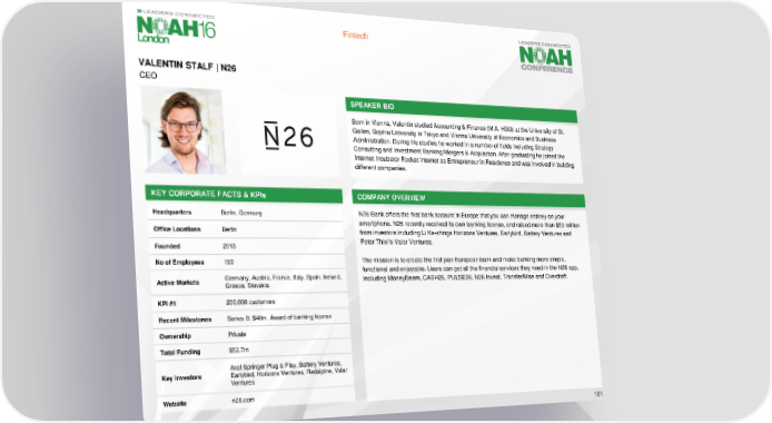 Fintech VALENTIN STALF | N26 CEO SPEAKER BIO Born in Vienna, Valentin studied Accounting & Finance (M.A. HSG) at the University of St. Gallen, Sophia University in Tokyo and Vienna University of Economics and Business Administration. During his studies he worked in a number of fields including Strategy Consulting and Investment Banking/Mergers & Acquisition. After graduating he joined the Internet Incubator Rocket Internet as Entrepreneur in Residence and was involved in building different companies. KEY CORPORATE FACTS & KPIs COMPANY OVERVIEW Headquarters Berlin, Germany N26 Bank offers the first bank account in Europe that you can manage entirely on your smartphone. N26 recently received its own banking license, and raised more than $53 million Office Locations Berlin from investors including Li Ka-shings Horizons Ventures, Earlybird, Battery Ventures and Founded 2013 Peter Thiel’s Valar Ventures. No of Employees 150 The mission is to create the first pan-European bank and make banking more simple, functional and enjoyable. Users can get all the financial services they need in the N26 app, Active Markets Germany, Austria, France, Italy, Spain, Ireland, including MoneyBeam, CASH26, PULSE26, N26 Invest, TransferWiseand Overdraft. Greece, Slovakia KPI #1 200,000 customers Recent Milestones Series B: $40m. Award of banking license Ownership Private Total Funding $52.7m Axel Springer Plug & Play, Battery Ventures, Key Investors Earlybird, Horizons Ventures, Redalpine, Valar Ventures Website n26.com 101