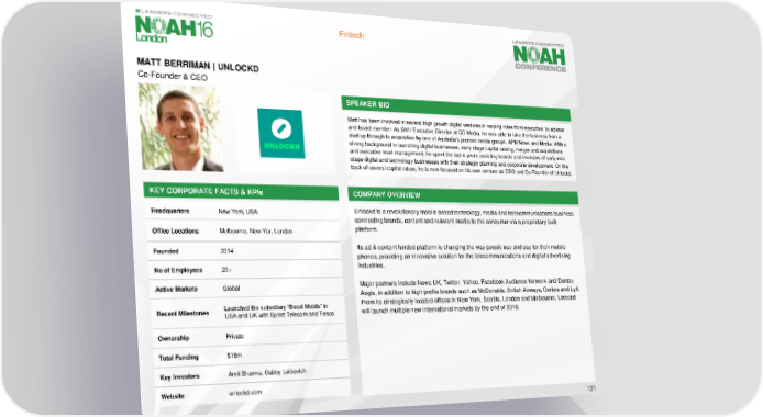 Fintech MATT BERRIMAN | UNLOCKD Co-Founder & CEO SPEAKER BIO Matt has been involved in several high growth digital ventures in varying roles from executive, to advisor and board member. As GM / Executive Director at CC Media, he was able to take the business from a start up through to acquisition by one of Australia’s premier media groups, APN News and Media. With a strong background in launching digital businesses, early stage capital raising, merger and acquisitions and executive level management, he spent the last 4 years assisting boards and investors of early-mid stage digital and technology businesses with their strategic planning and corporate development. On the back of several capital raises, he is now focused on his own venture as CEO and Co-Founder of Unlockd. KEY CORPORATE FACTS & KPIs COMPANY OVERVIEW Headquarters New York, USA Unlockd is a revolutionary mobile based technology, media and telecommunications business, connecting brands, content and relevant media to the consumer via a proprietary built Office Locations Melbourne, New Yor, London platform. Founded 2014 Its ad & content funded platform is changing the way people use and pay for their mobile phones, providing an innovative solution for the telecommunications and digital advertising No of Employees 20+ industries. Active Markets Global Major partners include News UK, Twitter, Yahoo, Facebook Audience Network and Dentsu Aegis, in addition to high profile brands such as McDonalds, British Airways, Doritos and Lyft. From its strategically located offices in New York, Seattle, London and Melbourne, Unlockd Recent Milestones Launched the subsidiary “Boost Mobile” in will launch multiple new international markets by the end of 2016. USA and UK with Sprint Telecom and Tesco Ownership Private Total Funding $16m Key Investors AmitSharma, Gabby Leibovich Website unlockd.com 121
