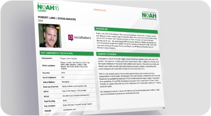 Infrastructure ROBERT LANG | SOCIALBAKERS CEO SPEAKER BIO Robert is the CEO of Socialbakers. Before joining Socialbakers, Robert was in charge of scaling and rolling out Criteo in several regions across the Globe. Prior to his time at Criteo, Robert Lang was the CEO of Result, which followed a position as Head of Europe and Country Manager Germany for fon.com - the world's largest WiFi community. Before fon, Robert was founder and CEO of Germany's largest WiFioperator: WLAN AG, acquired by Swisscom Group in 2003 and renamed to Swisscom Eurospot, Prior to that, Robert was VP Business Development and Finance for iobox Germany. KEY CORPORATE FACTS & KPIs COMPANY OVERVIEW Headquarters Prague, Czech Republic Socialbakers is one of the world’s largest social marketing & analytics suites, with over 2,700 clients in 100 countries - including half of the Global Fortune 500. In addition to offering one of Prague, London, San Francisco, New York, the largest databases of free social media statistics and insights in the world, we provide user- Office Locations Plzeň, Split, Singapore, Sydney, Paris, friendly social media solutions that allow brands to measure, compare, and optimize their Munich, São Paulo, Mexico City, Dubai, Istanbul social campaigns with competitive intelligence that is second to none. Founded 2008 With the only analytics platform that provides global industry benchmarking and local No of Employees 350 categorization in social media, Socialbakers is the most versatile, complete service of its kind. Facebook has awarded Socialbakers3 Preferred Marketing Developer badges in recognition Active Markets Worldwide of its capabilities. Since 2008, Socialbakers has grown from a small office in Pilsen, Czech Business Overview Social marketing and analytics suite Republic, to a global entity with nearly 400 employees of 32 nationalities, working in 14 offices across the globe. KPI #1 Over 2,700 clients in 100 countries Our developers have put in nearly 400,000 hours of product development in order to make KPI #2 400,000 hours of product development sure that Socialbakers products are constantly improving. Total Funding $34m Key Investors Index Ventures, Earlybird Venture Capital Website socialbakers.com 108