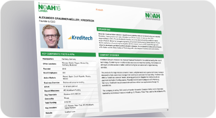 Fintech ALEXANDER GRAUBNER-MÜLLER | KREDITECH Founder & CEO SPEAKER BIO Alexander Graubner-Müller believes in algorithms and statistical data as the blocks for the next Industrial Revolution. Having led the tech-side of Kreditech as CTO for 3 years, he took over the CEO responsibilities in 2015. Prior to Kreditech’s founding, he co-founded and sold the prediction-market engine PredictX. Before he managed engineering and product development at Rocket Internet. Prior to that he worked as a financial engineer together with the research team at LGT Capital Management where he developed quantitative portfolio allocation strategies. He completed his studies at the University of St. Gallen and the Swiss Institute of Technology with a dual degree in business and econometrics. KEY CORPORATE FACTS & KPIs COMPANY OVERVIEW Headquarters Hamburg, Germany Kreditech Group’s mission is to improve financial freedom for the underbanked by the use of Warsaw, Madrid, Prague, Mexico City, technology. Combining non-traditional data sources and machine learning, the Company is Office Locations Hamburg, Bucharest aiming to provide access to better credit and a higher convenience for digital banking Founded 2012 services. No of Employees 330 The product offerings include consumer loans, a digital wallet and a personal finance manager Poland, Spain, Czech Republic, Russia, designed to help customers manage their credit score and plan their spending. Kreditech also Active Markets Mexico offers a “credit as a service” model, allowing partners to integrate its credit products as Business Overview End-to-end consumer lending payment method or funding source. Founded in 2012 and headquartered in Hamburg, Germany, Kreditech has processed almost three million loan applications through its KPI #1 N° of loans paid out subsidiaries. Recent Milestones IFC Worldbank Funding The company is led by CEO and Co-Founder Alexander Graubner-Müller and is financially Key Financials Revenue 2015: €41.3m backed by world-class investors including J.C. Flowers, Peter Thiel, and the World Bank’s IFC. Ownership Private Total Funding $152.1m Key Investors J.C. Flowers, Peter Thiel, IFC Worldbank, Värde Partners Website kreditech.com 81