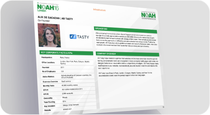 Infrastructure ALIX DE SAGAZAN | AB TASTY Co-Founder SPEAKER BIO After graduating from business school, Alix de Sagazan worked several years as a product manager for a media agency before switching to SEO/SEM. Driven by her entrepreneurial spirit, she decided to start her own business with colleague Rémi Aubert. Their company quickly evolved from a consulting agency to an A/B testing and personalisation technology provider. Fostered by rapid growth, AB Tasty now sells its platform worldwide and leads the European market. Alix is also involved in the investment fund Side Capital that helps promising startups to develop. KEY CORPORATE FACTS & KPIs COMPANY OVERVIEW Headquarters Paris, France AB Tasty helps marketers optimise their websites and increase conversion rates through A/B London, New York, Paris, Cologne, Madrid, testing, personalisation and user engagement. Users can easily modify pages and create new Office Locations Sydney designs thanks to our visual editor and our unique library of widgets - AB Tasty Engage. Apply Founded 2011 modifications to your website, read statistically accurate results in real-time and improve the user experience. No of Employees 104 AB Tasty has offices in Paris, London, Cologne, Madrid, Sydney and New York to Actively targeting all European countries, the Active Markets US and Australia accommodate clients’ need for prompt support in their own languages. Business Overview SaaSservice Monthly Visits 40,000 monthly visitors KPI #1 4bn visitors tested since 2011 KPI #2 2,500 accounts Ownership Private Total Funding $7m Key Investors XAnge, KimaVentures Website abtasty.com 19