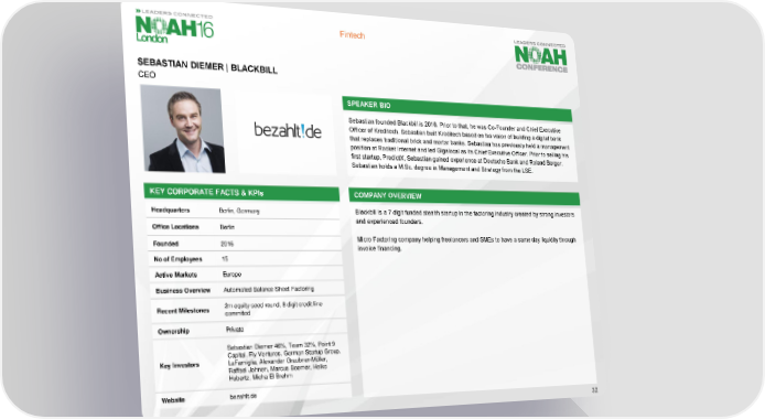 Fintech SEBASTIAN DIEMER | BLACKBILL CEO SPEAKER BIO Sebastian founded Blackbill is 2016. Prior to that, he was Co-Founder and Chief Executive Officer of Kreditech. Sebastian built Kreditech based on his vision of building a digital bank that replaces traditional brick and mortar banks. Sebastian has previously held a management position at Rocket Internet and led Gigalocal as its Chief Executive Officer. Prior to selling his first startup, PredictX, Sebastian gained experience at Deutsche Bank and Roland Berger. Sebastian holds a M.Sc. degree in Management and Strategy from the LSE. KEY CORPORATE FACTS & KPIs COMPANY OVERVIEW Headquarters Berlin, Germany Blackbill is a 7 digit funded stealth startup in the factoring industry created by strong investors and experienced founders. Office Locations Berlin Founded 2016 Micro Factoring company helping freelancers and SMEs to have a same day liquidity through invoice financing. No of Employees 15 Active Markets Europe Business Overview Automated Balance Sheet Factoring Recent Milestones 2m equity seed round, 8 digit credit line commited Ownership Private Sebastian Diemer 46%, Team 32%, Point 9 Capital, Fly Ventures, German Startup Group, Key Investors LaFamiglia, Alexander Graubner-Müller, Raffael Johnen, Marcus Boerner, Heiko Hubertz, Micha El Brehm Website bezahlt.de 32