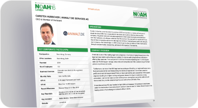 Infrastructure CARSTEN HÜBSCHER | ANWALT.DE SERVICES AG CEO & Member of the board SPEAKER BIO CarstenHübscherpresently holds the position of CEO and has been a member of the board of anwalt.de since 2008. He is responsible for the Sales and Customer Service divisions of the company. He gained vast and invaluable experience in direct sales of products and solutions in both the hardware and software market for Ocè-Deutschland. He acquired first insights and Know- how of Internet expertise whilst in the Management of Atrada Trading Network before founding his own company – the SalesBridge– in 2003 where he put his idea into effect of Sales Optimization through consistent sales- outsourcing, particularly with regard to IT-companies. KEY CORPORATE FACTS & KPIs COMPANY OVERVIEW Headquarters Nuremberg, Germany Anwalt.de is one of the leading legal-tech companies in Germany bringing transparency to the legal services market and acting as a mediator for clients seeking legal advice and lawyers Office Locations Nuremberg, Berlin offering their services. From our pool of 14.000 law firms encompassing over 18.500 lawyers Founded 2004 and over 70.000 lawyer- ratings, consumers and companies can find a suitable lawyer for their private or professional needs. No of Employees 100 Generate new clients for the registered Furthermore, our more than 800 legal service packages offered by our registered lawyers at a Business Overview lawyers fixed price provide full cost transparency for individual legal advice. Due to their personal profile on anwalt.de lawyers benefit from an improved visibility and accessibility within search Monthly Visits 1.6m monthly visits engines resulting in a higher ranking and greater demand for legal consultation among KPI #1 3.4m page impressions per month consumers. Last but not least our over 2000 authors, among them our juristic editorial staff from anwalt.de, provide valuable legal tips and advice from all fields of law. KPI #2 More than 14,000 lawyers Recent Milestones Website Relaunch in May 2016 Anwalt.de services AG was founded in April 2004 and engages 100 permanent employees under the leadership of executive board Carsten Hübscher and Dr. Stefan Morschheuser at its Key Financials Revenue 2015: €5.8m (€7.8m forcasted) headquarters in Nuremberg and a branch office in Berlin. EBITDA 2015: €1.1m (€1.9m forcasted) Key Investors Müller Medien, Stefan Morschheuser Website anwalt.de 24