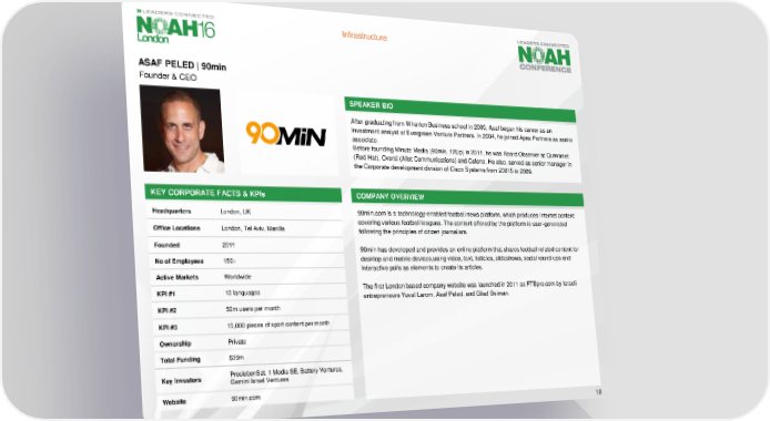 Infrastructure ASAF PELED | 90min Founder & CEO SPEAKER BIO After graduating from Wharton Business school in 2005, Asaf began his career as an investment analyst at Evergreen Venture Partners. In 2004, he joined Apax Partners as senior associate. Before founding Minute Media (90min, 12Up) in 2011, he was Board Observer at Qumranet (Red Hat), Oversi (Allot Communications) and Celeno. He also, served as senior manager in the Corporate development division of Cisco Systems from 20015 to 2009. KEY CORPORATE FACTS & KPIs COMPANY OVERVIEW Headquarters London, UK 90min.com is a technology-enabled football news platform, which produces Internet content covering various football leagues. The content offered by the platform is user-generated Office Locations London, Tel Aviv, Manilla following the principles of citizen journalism. Founded 2011 90min has developed and provides an online platform that shares football related content for No of Employees 150+ desktop and mobile devices,using video, text, listicles, slideshows, social round-ups and interactive polls as elements to create its articles. Active Markets Worldwide KPI #1 10 languages The first London based company website was launched in 2011 as FTBpro.com by Israeli entrepreneurs Yuval Larom, Asaf Peled, and Gilad Beiman. KPI #2 50m users per month KPI #3 15,000 pieces of sport content per month Ownership Private Total Funding $39m Key Investors ProsiebenSat. 1 Media SE, Battery Ventures, Gemini Israel Ventures Website 90min.com 18
