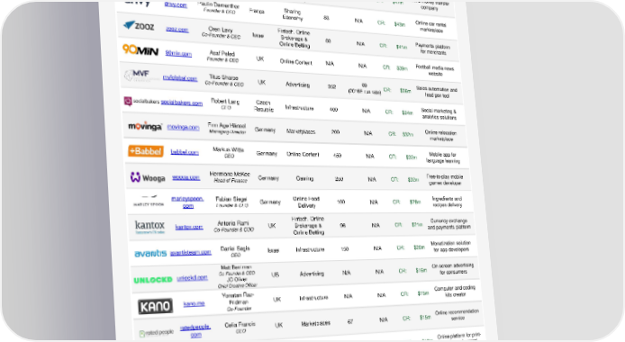 Presenting Companies MainStage 2015 EV / Cap. Company Website Speaker HQCountry Segment Employees Revenues ($m) Raised / Funds Business Description Carolin Gabor Fintech, Online Fintech company finleap.com Managing Director Germany Brokerage & 300 N/A CR: $50m builder Online Betting carprice.ru Oskar Hartmann Russia Marketplaces N/A N/A CR: $48m Online used car broker Founder & President and auctioneer Marta Krupinska Fintech, Online Online money transfer azimo.com GM & Co-Founder UK Brokerage & N/A N/A CR: $47m company Online Betting drivy.com Paulin Dementhon France Sharing 83 N/A CR: $43m Online car rental Founder & CEO Economy marketplace Oren Levy Fintech, Online Payments platform zooz.com Co-Founder & CEO Israel Brokerage & 80 N/A CR: $41m for merchants Online Betting 90min.com Asaf Peled UK Online Content N/A N/A CR: $39m Football media news Founder & CEO website mvfglobal.com Titus Sharpe UK Advertising 352 69 CR: $36m Sales automation and Co-Founder & CEO (2016E run rate) lead gen tool socialbakers.com Robert Lang Czech Infrastructure 400 N/A CR: $34m Social marketing & CEO Republic analytics solutions movinga.com Finn Age Hänsel Germany Marketplaces 200 N/A CR: $32m Online relocation Managing Director marketplace babbel.com Markus Witte Germany Online Content 450 N/A CR: $32m Mobile app for CEO language learning wooga.com Hermione McKee Germany Gaming 250 N/A CR: $32m Free-to-play mobile Head of Finance games developer marleyspoon. Fabian Siegel Germany Online Food 100 N/A CR: $28m Ingredients and com Founder & CEO Delivery recipes delivery Antonio Rami Fintech, Online Currency exchange kantox.com Co-Founder & COO UK Brokerage & 96 N/A CR: $21m and payments platform Online Betting avantisteam.com Daniel Sagis Israel Infrastructure 150 N/A CR: $20m Monetization solution CEO for app developers Matt Berriman On-screen advertising unlockd.com Co-Founder & CEO US Advertising N/A N/A CR: $16m JC Oliver for consumers Chief Creative Officer Yonatan Raz- Computer and coding kano.me Fridman UK Infrastructure N/A N/A CR: $15m kits creator Co-Founder ratedpeople. Celia Francis UK Marketplaces 67 N/A CR: $15m Online recommendation com CEO service spreadshirt.net Philip Rooke Germany Ecommerce 500 96 CR: $13m Online platform for print- CEO on-demand apparel Eric Podzuweit Digital investment scalable.capital Co-Founder & UK Fintech 40 N/A CR: $12m service Co-CEO jobtoday.com Polina Montano Luxembourg Online Content 70 N/A CR: $10m Mobile app for job Co-Founder & COO applications Rémi Aubert E-marketing web abtasty.com Founder & CEO UK Infrastructure 104 N/A CR: $7m Alix de Sagazan optimization tool Founder woo.io Liran Kotzer Israel Marketplaces 32 N/A CR: $5m Tech talent Founder & CEO recruiting tool Note: All private company valuations are based on public news. * Public company. 9