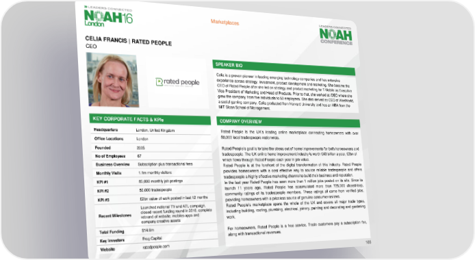 Marketplaces CELIA FRANCIS | RATED PEOPLE CEO SPEAKER BIO Celia is a proven pioneer in leading emerging technology companies and has extensive experience across strategy, investment, product development and marketing. She became the CEO of Rated People after she led on strategy and product marketing for T-Mobile as Executive Vice-President of Marketing and Head of Products. Prior to that, she worked at IDEO where she grew the company from five individuals to 50 employees. She also served as CEO at WeeWorld, a social gaming company. Celia graduated from Harvard University and has an MBA from the MIT Sloan School of Management. KEY CORPORATE FACTS & KPIs COMPANY OVERVIEW Headquarters London, United Kingdom Rated People is the UK’s leading online marketplace connecting homeowners with over Office Locations London 50,000local tradespeoplenationwide. Founded 2005 Rated People’s goal is to take the stress out of home improvements for both homeowners and No of Employees 67 tradespeople. The UK online home improvement industry is worth £43 billion a year, £2bn of Business Overview Subscription plus transactional fees which flows through Rated People each year in job value. Rated People is at the forefront of the digital transformation of this industry. Rated People Monthly Visits 1.1m monthly visitors provides homeowners with a cost effective way to source reliable tradespeople and offers KPI #1 85,000 monthly job postings tradespeoplea highly effective marketing channel to build their business and reputation. In the last year Rated People has seen more than 1 million jobs posted on its site. Since its KPI #2 50,000 tradespeople launch 11 years ago, Rated People has accumulated more than 725,000 closed-loop, KPI #3 £2bn value of work posted in last 12 months community ratings of its tradespeople members. These ratings all come from verified jobs, providing homeowners with a priceless source of genuine consumer reviews. Launched national TV and ATL campaign, Rated People’s marketplace spans the whole of the UK and covers all major trade types, Recent Milestones closed recent funding round in 2016, complete including building, roofing, plumbing, electrical, joinery, painting and decorating and gardening rebrand of website, mobiles apps and work. company creative assets Total Funding $14.6m For homeowners, Rated People is a free service. Trade customers pay a subscription fee, Key Investors Frog Capital along with transactional revenues. Website ratedpeople.com 105