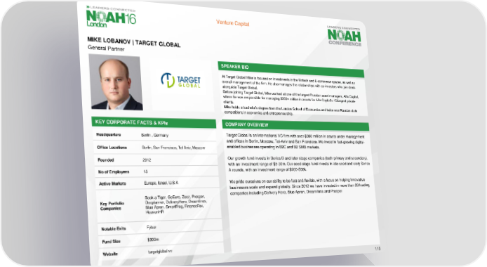 Venture Capital MIKE LOBANOV | TARGET GLOBAL General Partner SPEAKER BIO At Target Global Mike is focused on investments in the Fintech and E-commerce spaces, as well as overall management of the firm. He also manages the relationships with co-investors who join deals alongside Target Global. Before joining Target Global, Mike worked at one of the largest Russian asset managers, Alfa Capital, where he was responsible for managing $200+ million in assets for Alfa Capital’s 15 largest private clients. Mike holds a bachelor’s degree from the London School of Economics and twice won Russian state competitions in economics and entrepreneurship. KEY CORPORATE FACTS & KPIs COMPANY OVERVIEW Headquarters Berlin , Germany Target Global is an international VC firm with over $300 million in assets under management and offices in Berlin, Moscow, Tel-Aviv and San Francisco. We invest in fast-growing digital- Office Locations Berlin, San Francisco, Tel Aviv, Moscow enabled businesses operating in B2C and B2 SMB markets. Founded 2012 Our growth fund invests in Series B and later stage companies (both primary and secondary), with an investment range of $5-30m. Our seed stage fund invests in late seed and early Series No of Employees 15 A rounds, with an investment range of $200-500k. Active Markets Europe, Israel, U.S.A We pride ourselves on our ability to be fast and flexible, with a focus on helping innovative businesses scale and expand globally. Since 2012 we have invested in more than 20 leading Book a Tiger, GoEuro, Zooz, Prosper, companies including Delivery Hero, Blue Apron, Dreamlines and Prosper Key Portfolio Docplanner, DeliveryHero, Dreamlines, Companies Blue Apron, SmartFrog, FinanceFox, HeavenHR Notable Exits Fyber Fund Size $300m Website targetglobal.vc 115