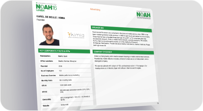 Advertising KAREL DE BEULE | KIMIA Founder SPEAKER BIO Karel started his career as a consultant in the telco and media sectors, since 1998 he has been marketing mobile media services. In 2005 he quit his job and started his first company. Since then he has co-founded three start-ups: Sirius MTI (a TIC consultancy that was successfully merged), Kimia (a mobile media network, currently employing 150 people), HeYouGames (a social games studio, currently employing 30 people) Enthusiast. Hard worker. Passionate about mobile. Avid traveler. Ironman triathlete. Flappy bird high score: 89. KEY CORPORATE FACTS & KPIs COMPANY OVERVIEW Headquarters Madrid, Spain Kimia is a fast growing online media network focusing on mobile entertainment services. Founded by mobile industry veterans, privately funded, we are an independent, owner- Office Locations Madrid, Mumbai, Shanghai managed company. Founded 2006 We operate globally with a team of 150+ professionals native in 15 languages. Our headquarters are in Madrid, Spain with offices in Mumbai and Shanghai. No of Employees 150 Business Overview Mobile performance marketing Monthly Visits 3bn monthly visits KPI #1 100m daily users KPI #2 350,000 daily conversion events (CPA / CPL / CPI) Ownership 80% management –15% VC – 5% friends & family Website kimia.mobi 79