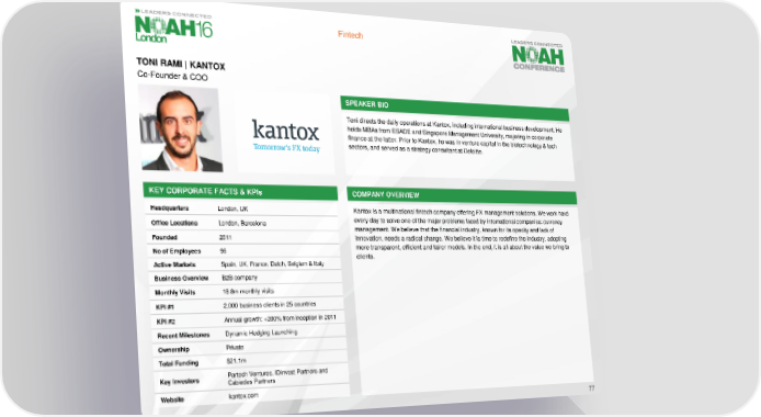 Fintech TONI RAMI | KANTOX Co-Founder & COO SPEAKER BIO Toni directs the daily operations at Kantox, including international business development. He holds MBAs from ESADE and Singapore Management University, majoring in corporate finance at the latter. Prior to Kantox, he was in venture capital in the biotechnology & tech sectors, and served as a strategy consultant at Deloitte. KEY CORPORATE FACTS & KPIs COMPANY OVERVIEW Headquarters London, UK Kantox is a multinational fintech company offering FX management solutions. We work hard Office Locations London, Barcelona every day to solve one of the major problems faced by international companies: currency management. We believe that the financial industry, known for its opacity and lack of Founded 2011 innovation, needs a radical change. We believe it is time to redefine the industry, adopting No of Employees 96 more transparent, efficient and fairer models. In the end, it is all about the value we bring to clients. Active Markets Spain, UK, France, Dutch, Belgium & Italy Business Overview B2B company Monthly Visits 18.8m monthly visits KPI #1 2,000 business clients in 25 countries KPI #2 Annual growth: +200% from inception in 2011 Recent Milestones Dynamic Hedging Launching Ownership Private Total Funding $21.1m Key Investors Partech Ventures, IDinvest Partners and Cabiedes Partners Website kantox.com 77