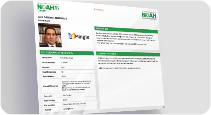 Advertising GUY DANON | ADMINGLE Global CEO SPEAKER BIO Guy has been adMingle’s Global CEO since the start of 2016, having joined from SAP’s Europe, Middle East & Africa headquarters after 10 years, in order to drive adMingle’s transformation into the leading technology provider for enterprises to handle their influencer relationship management. Prior to SAP, Guy has accomplished the international MBA Program at HEC. KEY CORPORATE FACTS & KPIs COMPANY OVERVIEW Headquarters Ramat Gan, Israel CRM for Influencers (=IRM) is a scalable performance-based SaaS platform that allows Advertisers to develop direct relationships with Influencers (from Opinion leaders to ordinary Office Locations 15 offices people) via multiple touch points and use use cases. Founded 2014 adMingle is present in nearly 15 countries across 4 continents. No of Employees 10 Active Markets Global Geographic expansion across 4 continents. Having generated revenues for the past 2 Recent Milestones years. Shifted from pure adTech to becoming a SaaS-based technology provider Ownership Self-Funded Total Funding $0.9m Key Investors Shlomi Selim Benbasat, Founder Website admingle.com 21