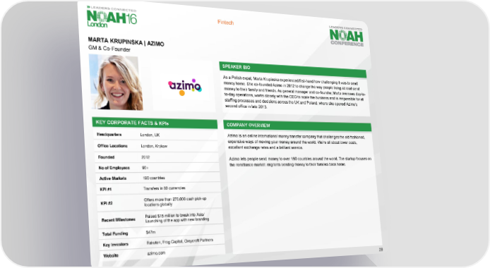Fintech MARTA KRUPINSKA | AZIMO GM & Co-Founder SPEAKER BIO As a Polish expat, Marta Krupinska experienced first-hand how challenging it was to send money home. She co-founded Azimo in 2012 to change the way people living abroad send money to their family and friends. As general manager and co-founder, Marta oversees day-to- to-day operations, works closely with the CEO to scale the business and is responsible for all staffing processes and decisions across the UK and Poland, where she opened Azimo’s second office in late 2013. KEY CORPORATE FACTS & KPIs COMPANY OVERVIEW Headquarters London, UK Azimois an online international money transfer company that challenges the old fashioned, expensive ways of moving your money around the world. We’re all about lower costs, Office Locations London, Krakow excellent exchange rates and a brilliant service. Founded 2012 Azimolets people send money to over 190 countries around the world. The startup focuses on No of Employees 90+ the remittance market: migrants sending money to their families back home. Active Markets 190 countries KPI #1 Transfers in 80 currencies KPI #2 Offers more than 270,000 cash pick-up locations globally Recent Milestones Raised $15 million to break into Asia/ Launching of the app with new branding Total Funding $47m Key Investors Rakuten, Frog Capital, Greycroft Partners Website azimo.com 29