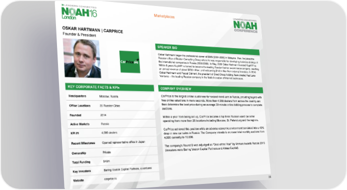 Marketplaces OSKAR HARTMANN | CARPRICE Founder & President SPEAKER BIO Oskar Hartmann began his professional career at BMW (2004-2006) in Malaysia. Then, he joined the Russian office of Boston Consulting Group where he was responsible for developing business strategy of the international companies in Russia (2006-2008). In May, 2008 Oskar Hartmann founded KupiVIP.ru. Within 6 years KupiVIP.ru turned to become the leading Russian fashion e-commerce company, reaching an annual revenue of about $200 million, and welcoming $140 million from external investors. In 2010 Oskar Hartmann and Pascal Clément, the president of Direct Group holding, have created Fast Lane Ventures – the leading Russian company in the field of creation of Internet businesses. KEY CORPORATE FACTS & KPIs COMPANY OVERVIEW Headquarters Moscow, Russia CarPrice is the largest online auctioneer for second-hand cars in Russia, providing buyers with free online valuations in mere seconds. More than 4,000 dealers from across the country can Office Locations 20 Russian Cities then determine the best price during an average 30-minute online bidding process to complete auctions. Founded 2014 Within a year from being set up, CarPrice became a top three Russian used car seller Active Markets Russia operating from more than 20 locations including Moscow, St. Petersburg and the regions. KPI #1 4,000 dealers CarPrice achieved this position while an adverse economic environment translated into a 40% drop in new car sales in Russia. The Company intends to increase total monthly auctions from 4,000 currently to 10,000. Recent Milestones Opened representative office in Japan The company's Round B was adjudged as "Deal of the Year" by Venture Awards Russia 2015 Ownership Private (investors were Baring Vostok Capital Partners and Almaz Capital). Total Funding $46m Key Investors Baring Vostok Capital Partners, e.ventures Website carprice.ru 36
