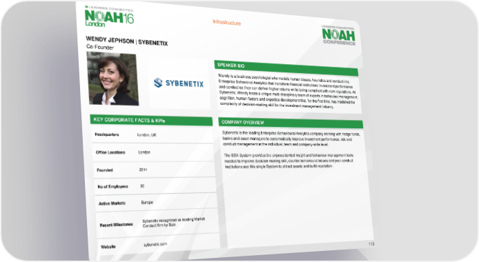 Infrastructure WENDY JEPHSON | SYBENETIX Co-Founder SPEAKER BIO Wendy is a business psychologist who models human biases, heuristics and conduct into Enterprise Behavioral Analytics that transform financial institutions’ investment performance and conduct so they can deliver higher returns while being compliant with new regulations. At Sybenetix, Wendy leads a unique multi-disciplinary team of experts in behaviour management, cognition, human factors and expertise development that, for the first time, has modelled the complexity of decision-making skill for the investment management industry. KEY CORPORATE FACTS & KPIs COMPANY OVERVIEW Headquarters London, UK Sybenetix is the leading Enterprise Behavioural Analytics company working with hedge funds, banks and asset managers to systematically improve investment performance, risk and conduct management at the individual, team and company-wide level. Office Locations London The EBA System provides the unprecedented insight and behaviour management tools needed to improve decision-making skill, counter behavioural biases and poor conduct. Founded 2011 Institutions use this single System to attract assets and build reputation. No of Employees 30 Active Markets Europe Recent Milestones Sybenetix recognized as leading Market Conduct firm by Bain Website sybenetix.com 113