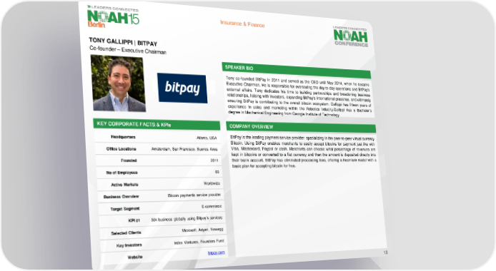Insurance & Finance TONY GALLIPPI | BITPAY Co-founder – Executive Chairman SPEAKER BIO Tony co-founded BitPay in 2011 and served as the CEO until May 2014, when he became Executive Chairman. He is responsible for overseeing the day-to-day operations and BitPay’s external affairs. Tony dedicates his time to building partnerships and broadening business relationships, liaising with investors, expanding BitPay’s international presence, and ultimately ensuring BitPay is contributing to the overall bitcoin ecosystem. Gallippi has fifteen years of experience in sales and marketing within the Robotics industry.Gallippi has a Bachelor’s degree in Mechanical Engineering from Georgia Institute of Technology KEY CORPORATE FACTS& KPIs COMPANY OVERVIEW Headquarters Atlanta, USA BitPay is the leading payment service provider specializing in the peer-to-peer virtual currency Bitcoin. Using BitPay enables merchants to easily accept bitcoins for payment just like with Office Locations Amsterdam, San Francisco, Buenos Aires Visa, Mastercard, Paypal or cash. Merchants can choose what percentage of revenues are kept in bitcoins or converted to a fiat currency and then the amount is deposited directly into Founded 2011 their bank account. BitPay has eliminated processing fees, offering a freemium model with a basic plan for accepting bitcoin for free. No of Employees 69 Active Markets Worldwide Business Overview Bitcoin payments service provider Target Segment E-commerce KPI#1 50k business globally using Bitpay’s services Selected Clients Microsoft, Adyen, Newegg Key Investors Index Ventures, Founders Fund Website bitpay.com 13