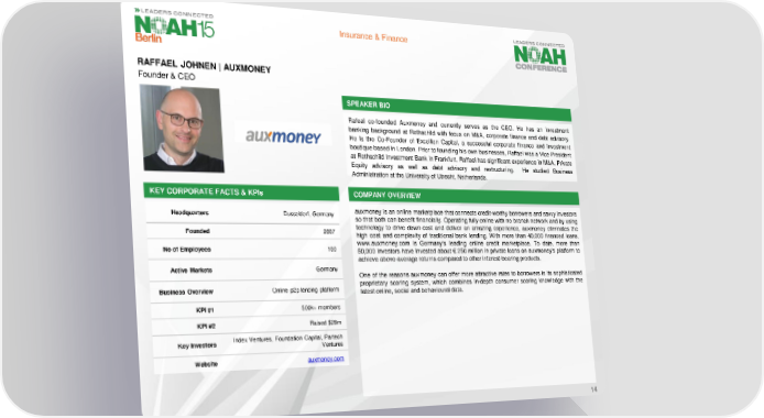 Insurance & Finance RAFFAEL JOHNEN | AUXMONEY Founder & CEO SPEAKER BIO Rafeal co-founded Auxmoney and currently serves as the CEO. He has an investment banking background at Rothschild with focus on M&A, corporate finance and debt advisory. He is the Co-Founder of Excellion Capital, a successful corporate finance and investment boutique based in London. Prior to founding his own businesses, Raffael was a Vice President at Rothschild Investment Bank in Frankfurt. Raffael has significant experience in M&A, Private Equity advisory as well as debt advisory and restructuring. He studied Business Administration at the University of Utrecht, Netherlands. KEY CORPORATE FACTS& KPIs COMPANY OVERVIEW Headquarters Dusseldorf, Germany auxmoneyis an online marketplace that connects credit-worthy borrowers and savvy investors so that both can benefit financially. Operating fully online with no branch network and by using Founded 2007 technology to drive down cost and deliver an amazing experience, auxmoney eliminates the high cost and complexity of traditional bank lending. With more than 40,000 financed loans, No of Employees 100 www.auxmoney.com is Germany’s leading online credit marketplace. To date, more than 50,000 investors have invested about € 250 million in private loans on auxmoney’s platform to achieve above-averagereturns comparedto other interest-bearing products. Active Markets Germany One of the reasons auxmoney can offer more attractive rates to borrowers is its sophisticated Business Overview Online p2p lending platform proprietary scoring system, which combines in-depth consumer scoring knowledge with the latest online, social and behavioural data. KPI#1 500k+ members KPI #2 Raised $28m Key Investors Index Ventures, Foundation Capital, Partech Ventures Website auxmoney.com 14
