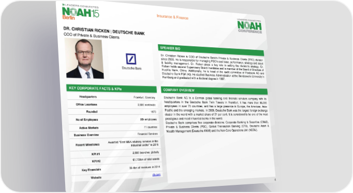 Insurance & Finance DR. CHRISTIAN RICKEN | DEUTSCHE BANK COO of Private & Business Clients SPEAKER BIO Dr. Christian Ricken is COO of Deutsche Bank’s Private & Business Clients (PBC) division since 2008. He is responsible for managing PBC’s cost base, performance, strategy and asset & liability management. Dr. Ricken plays a key role in setting the division’s strategy. Dr. Ricken holds several Supervisory Board mandates and is member of the Board of Directors of HuaXia Bank, China. Additionally, he is head of the audit committee of Postbank AG and Deutsche Bank PGK AG. He studied Business Administration at the Bundeswehr University in Hamburgandgraduatedwithadoctoraldegreein 1997. KEY CORPORATE FACTS& KPIs COMPANY OVERVIEW Headquarters Frankfurt, Germany Deutsche Bank AG is a German global banking and financial services company with its headquarters in the Deutsche Bank Twin Towers in Frankfurt. It has more than 90,000 Office Locations 2,800 worldwide employees in over 70 countries, and has a large presence in Europe, the Americas, Asia- Founded 1870 Pacific and the emerging markets. In 2009, Deutsche Bank was the largest foreign exchange dealer in the world with a market share of 21 per cent. It is considered to be one of the most No of Employees 98k employees prestigious and most influential banks in the world. Deutsche Bank comprises five corporate divisions: Corporate Banking & Securities (CB&S), Active Markets 71 countries Private & Business Clients (PBC), Global Transaction Banking (GTB), Deutsche Asset & Business Overview Financial Services WealthManagement(DeutscheAWM)andtheNon-Core OperationsUnit (NCOU). Recent Milestones Awarded “Best M&A advisory services in the industrial sector” in 2015 KPI#1 2,800 branches globally KPI #2 €1.709bn of total assets Key Financials 39.4bn of revenues in 2014 Website db.com 4